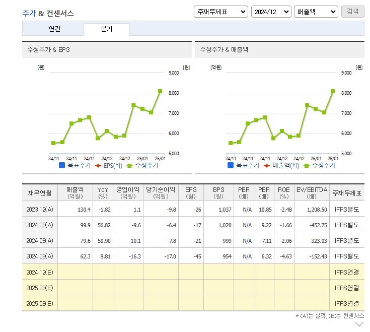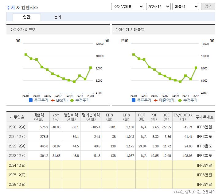 2024년 예상 분기별 실적을 보면 매출액은 감소하는 추세로 보이고 영업이익 및 당기순이익 조차도 적자가 난 상태라 볼 수 있습니다.