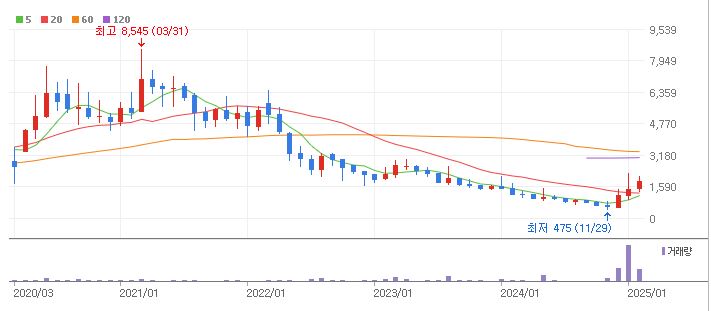 현재 거래가는 1800원대에서 맴돌고 있으며 최고가는 2021년 2월경 8545원까지 올라갔었네요.