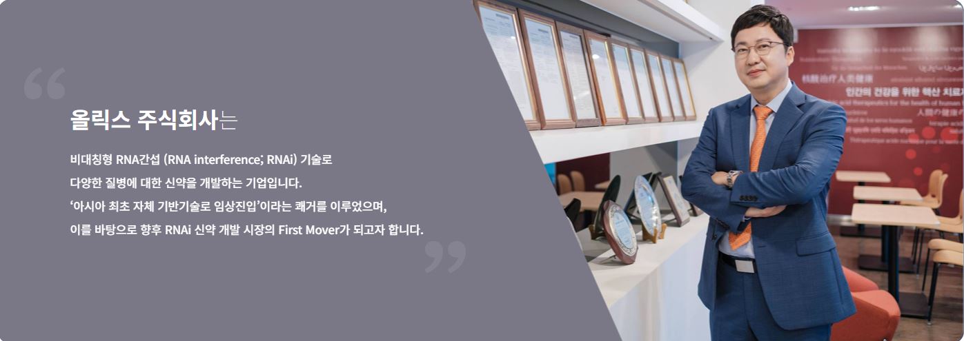 올릭스는 RNA 간섭 플랫폼 기술 기반의 신약 개발 기업으로 유전자치료제 신약 개발사 2010 BMT 주식회사(Bio Molecular Technology, Inc)로 설립되어 2014년 올릭스 주식회사 (OliX Pharmaceuticals, Inc.)로 사명을 변경하였습니다. 올릭스의 플랫폼 주요 기술로는 비대칭 asiRNA, 긴비대칭 lasiRNAM, 자가전달비대칭 cp-asiRNA이 원천 핵심 기술폼 기술이며, 관련 특허를 국내외 보유하고 있습니다. 지난 2017년 기술평가에는 모두 A등급을 받았고 2018년 코스닥 시장에 기술특례기업으로 상장되었습니다.